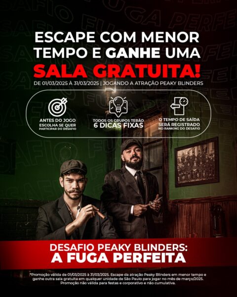 O Escape 60′, pioneiro em jogos de fuga presenciais e online no Brasil, lança um desafio eletrizante para os fãs de Peaky Blinders. Durante todo o mês de março, a equipe que escapar da sala temática, na unidade Vila Olímpia, no menor tempo possível será premiada com uma nova experiência gratuita em qualquer unidade da […]